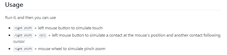 https://github.com/Legend-Master/windows-touch-simulator https://github.com/Legend-Master/windows-touch-simulator/releases github技巧:作者通常会把编译好的 exe/ 安装包放在 Releases 板块.使用方法:[right ...