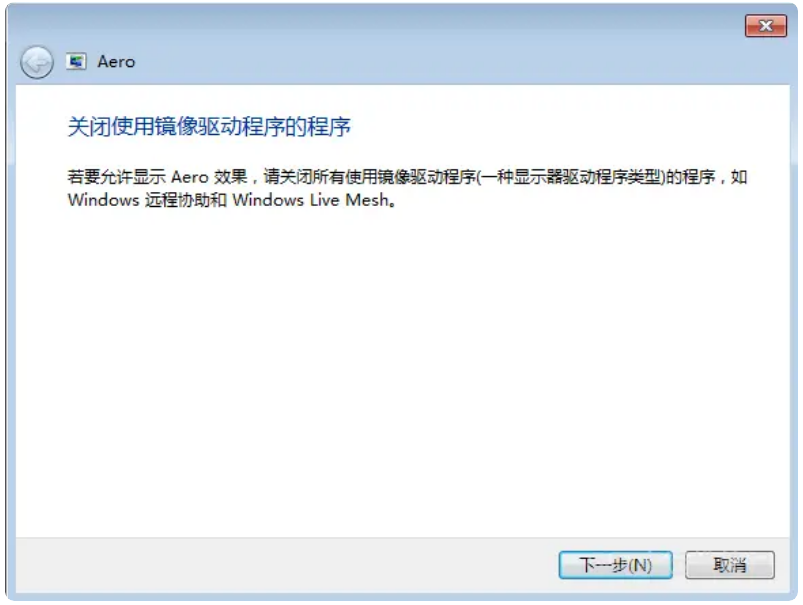 若要允许显示Aero效果,请关闭所有使用镜像驱动程序(一种显示器驱动程序类型)的程序,如Windows远程协助和Windows live Mesh。