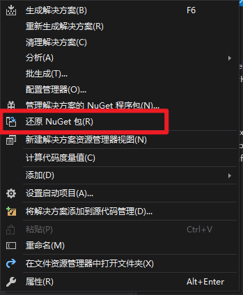 手动还原 NuGet 包1.将旧项目的packages.config文件复制到新项目根目录下(与.csproj文件同级);2.编辑旧项目和新项目的.csproj文件,对比此文件,复制旧文件其中<Reference>节点(NuGet包的引用部分)到新项目的.csproj中,保存后重新加载项目;3.打开新项目的解决方案,右键点击解决方案名称,选择还原...